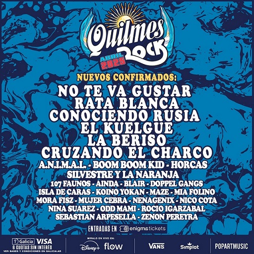 Quilmes Rock 2025 continúa creciendo e incorporando artistas a su grilla. Ahora, se anuncian las actuaciones de No Te Va Gustar, Rata Blanca, Conociendo Rusia, El Kuelgue, La Beriso y Cruzando el Charco, para una edición que promete ser inolvidable. Como si fuera poco, también serán de la partida: A.N.I.M.A.L., Boom Boom Kid, Horcas y Silvestre y La Naranja, entre otros que también se suman a los shows ya confirmados de Andrés Calamaro, Los Fabulosos Cadillacs, Miranda!, Las Pelotas, Las Pastillas del Abuelo, Los Auténticos Decadentes, Dillom y El Mató a un Policía Motorizado. Grandes nombres de nuestra música, sin olvidar la presencia épica e histórica de Serú Girán, junto a una lista impactante de otras figuras que elevarán aún más el nivel de este festival.
