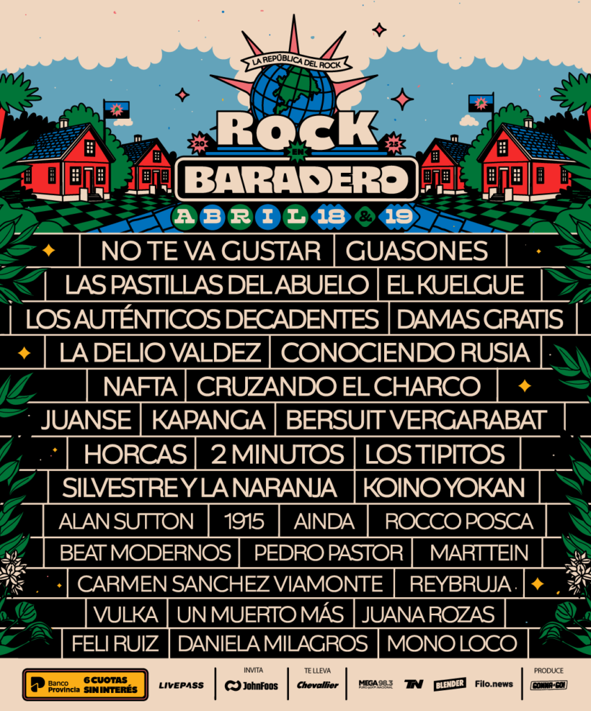 Los nombres que anunciaron su presencia en Baradero dan cuenta de la fiesta que ya se prepara en este icónico festival. Agrupaciones y músicos pilares del rock latinoamericano como No te va gustar, Guasones, Las Pastillas del Abuelo, Los auténticos decadentes, Juanse, Kapanga, Bersuit Vergarabat, Horcas, 2 minutos y Los Tipitos subirán sus canciones legendarias y nuevos materiales al escenario de la República del Rock.